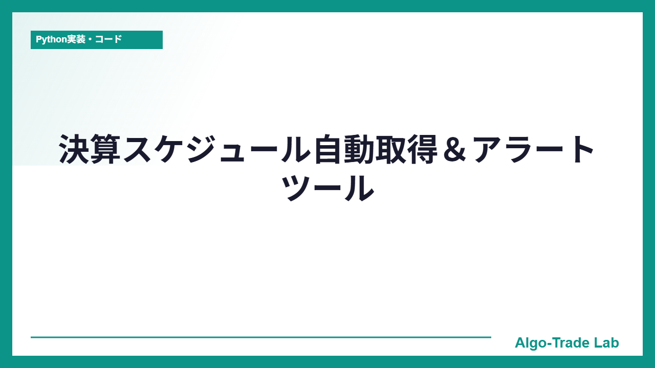 決算発表は株価が大きく動くイベントです。「うっかり決算日を忘れていて損した」を防ぐために、Pythonで決算スケジュールを自動取得してアラートを出すツールを作ります。