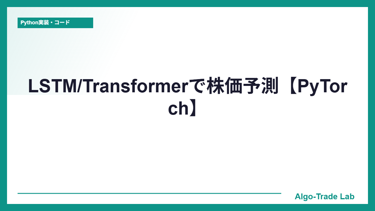 LSTMとTransformerの両アーキテクチャをPyTorchで実装しました。Transformerは並列処理が得意で長期依存関係の捉えに優れます。LSTMはシンプルで扱いやすく、入門には最適です。実際の運用では必ずバックテストで有効性を検証してください。