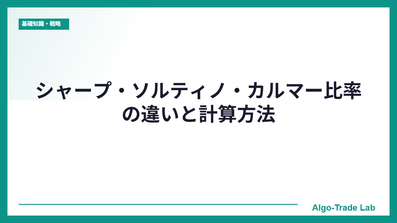 投資戦略のパフォーマンスを評価する際、「リターンが高い」だけでは不十分です。リスクに対してどれだけのリターンが得られているかを示す指標が重要です。この記事ではシャープレシオ・ソルティノレシオ・カルマー比率の違いと計算方法を解説します。